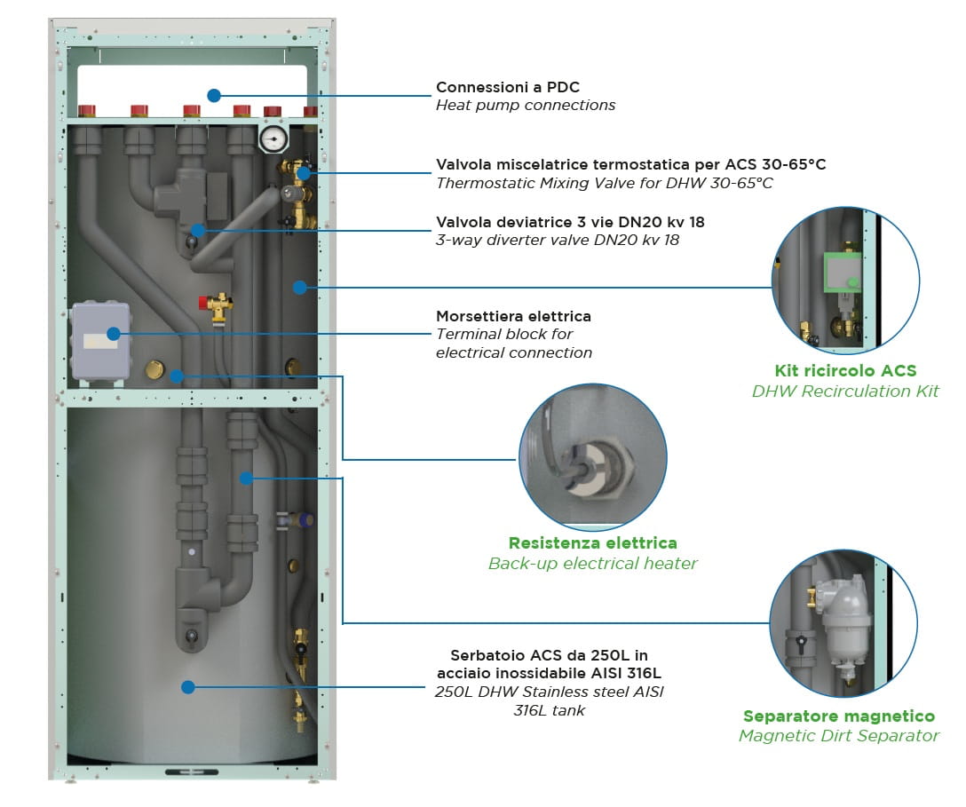 Tato vnitřní hydraulická věž představuje komplexní a prostorově úsporné řešení pro moderní otopné systémy. Je speciálně navržena pro propojení s monoblokovými tepelnými čerpadly o výkonu až do 16 kW. Jednotka v sobě integruje všechny nezbytné komponenty pro efektivní distribuci tepla a ohřev vody, čímž výrazně zjednodušuje a zrychluje montáž v kotelně.Klíčové vlastnosti a výhody:Vše v jednom (All-in-one): Věž integruje klíčové prvky systému, což eliminuje potřebu složitého propojování jednotlivých komponent a šetří drahocenné místo.Velkokapacitní zásobník TUV: Součástí je 250litrový smaltovaný zásobník pro přípravu teplé užitkové vody, který pokryje potřeby běžné rodiny.Špičkový nerezový výměník: Speciální výměník s nerezovými vlnovcovými trubkami o ploše 3 m² zajišťuje extrémně efektivní předávání tepla.Vysoký tepelný výkon: Díky tenkostěnnému provedení nerezových trubek dosahuje systém vyšší tepelné výtěžnosti a rychlejšího ohřevu vody než standardní výměníky z běžné oceli. Dlouhá životnost: Použití nerezové oceli a kvalitních komponent zaručuje odolnost proti korozi a minimální nároky na údržbu. Určeno pro výkon TČ až do 16 kW (monoblok). Objem zásobníku TUV 250 litrů. Plocha výměníku 3 m². Materiál výměníku nerezová ocel (vlnovec). Typ instalace vnitřní jednotka.